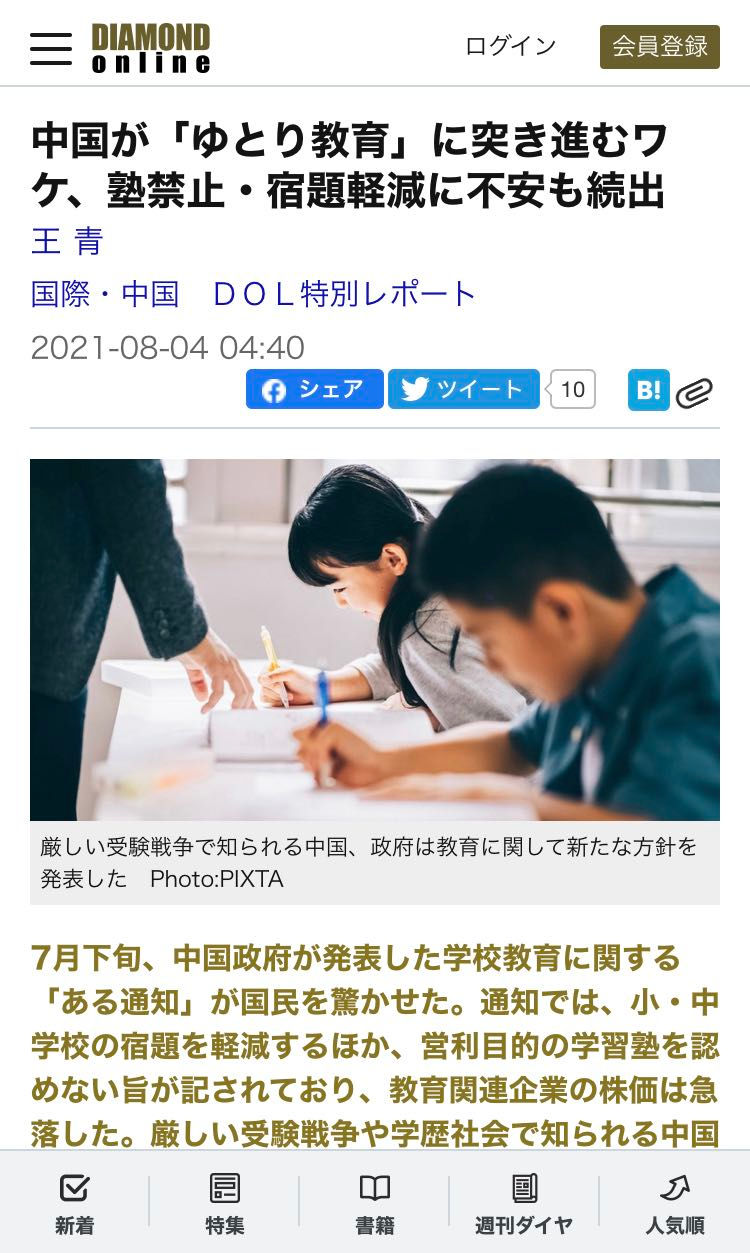 寄稿した記事です。 思ってもみないツイッターやNewsPicksなどのSNSで大きな反響がありました… 7月24日、中国政府は、重い政策を打ち出しました。 「全ての地域で義務教育段階の生徒の宿題負担を軽減、学外教育の負担を軽減する」という方針。 これにより、教育産業は大きな打撃を加えられました。塾関連の企業の株価が軒並み急落しました。 これまで、中国は学業をもっとも重視、厳しい受験競争、学歴社会として知られてきました。そのため、親は子どもの勉強に全力を捧げ、教育費が家計に大きな負担となっています。「こどもの教育にこれほど財力と精力がかかるから、それ以上こどもを産みたくない」との思いで、少子化に拍車かかりました。 国が「人口の維持が持続する経済発展にとって不可欠」ということで、まず教育負担の軽減からメスを入れた格好です。 「速い決断、合理的、そして強引」というのは中国政府が政策の転換や改革に取り組む際の特徴であると言えるかもしれないです。今回の方針もその好例でしょう。 しかし、これって、本当に効果があるのか、教育関係者らや親、生徒に大きな影響を与えることは明らかで、不安で仕方がありません。また、塾関連企業の従業員の失業への対策など気になります。 一体、どんな政策なのか、ぜひ、ご一読ください。 https://diamond.jp/articles/-/278541