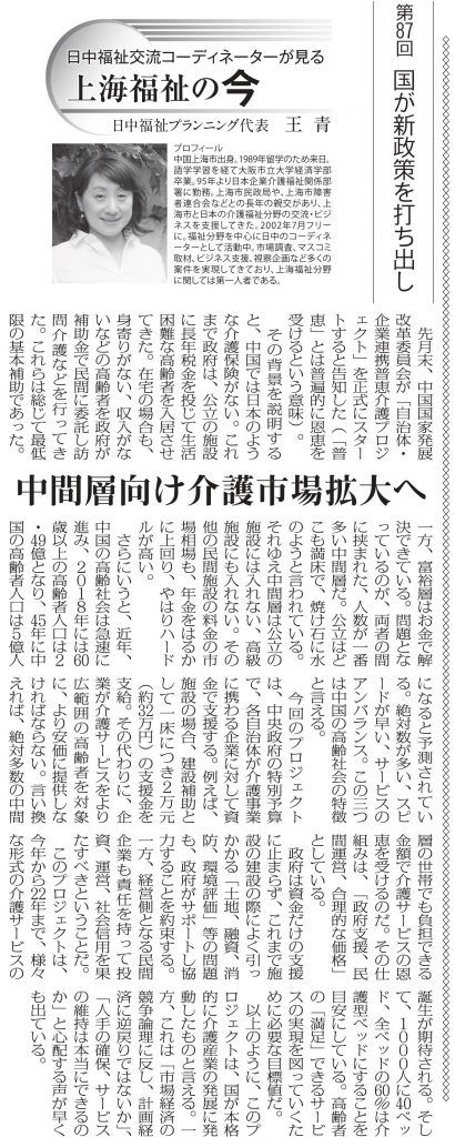 今年2月、中国政府が中間層の介護サービスを拡大する方針を告知しました。「自治体・企業連携普恵介護プロジェクト」を正式にスタートさせました。これは大きなニュースとなり、中国の各マスコミにより一斉に報道されました。その背景には、どんどん深刻化する少子高齢化があります。国の社会保障制度の整備が追い付かない中で、国と民間が手を組んで、ともに高齢化社会問題に臨むという姿勢であります。これまで、大手上場企業、デベロッパーなどが富裕層市場にばかり目を向けていましたが、実際のところ中間層は人数もニーズも一番大きいということで、今回の新しい政策を踏み出した格好となります。その背景や中身を記事で紹介いたしました。ぜひご参考くださいませ。高齢者住宅新聞 連載 中国、中間層の介護サービスを拡大政策